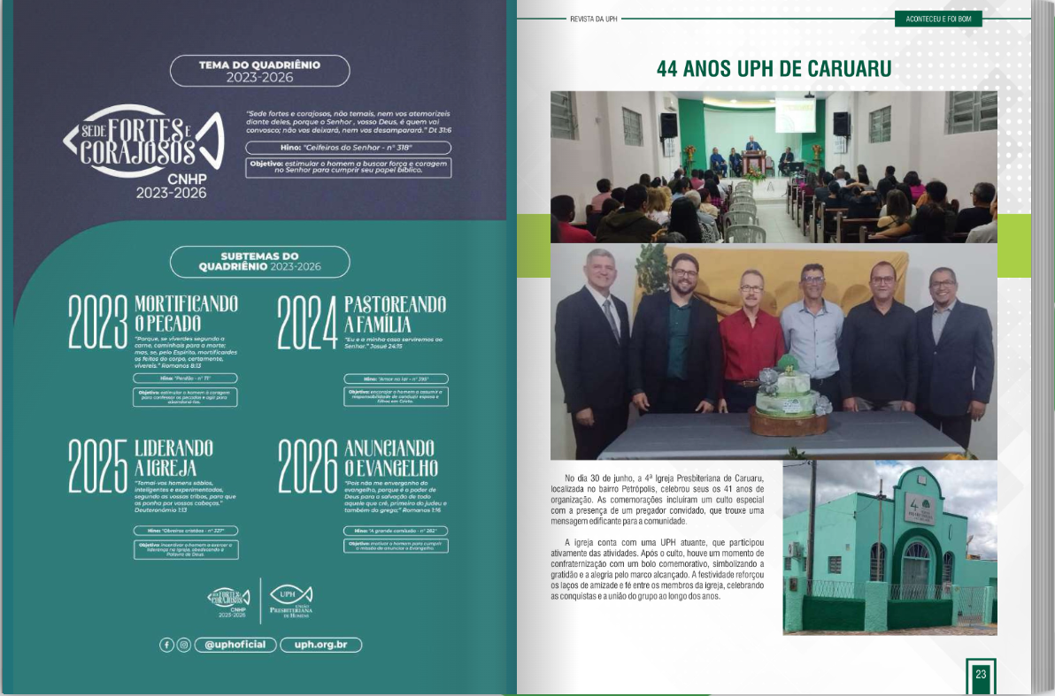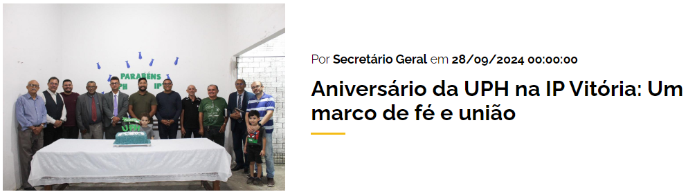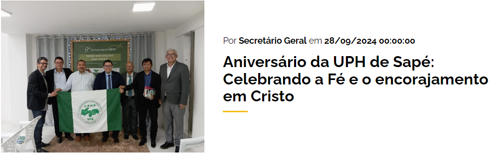 Através de ações como “Mão na Massa” e “Consolo para os que Choram”, a UPH demonstra a força da fé em ação. Esses projetos oferecem oportunidades para você se envolver e levar esperança a quem mais precisa. Venha conhecer e fazer parte desse movimento comprometido com o Reino de Deus.